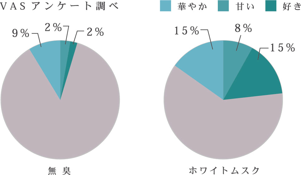 ホワイトムスクの香りを吸い込んだとき、アンケートの他の変数と比較して、「華やか」「好き」「甘い」の変化の割合が最も高く、ポジティブな感情へと変化することが示されました。