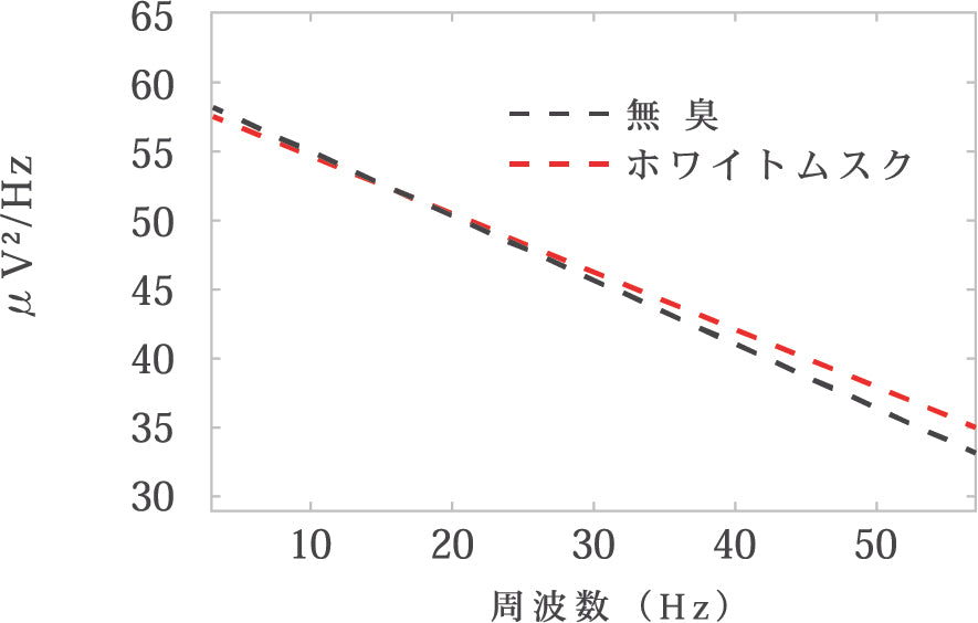 ホワイトムスクの香りを嗅ぐと、1/f ゆらぎの傾きが緩やかになることが示されました。「好き」を感じるとドーパミンの分泌が増え、脳内の振動活動の増加に影響を与え、1/f ゆらぎラインが緩やかになる傾向が考察されています。