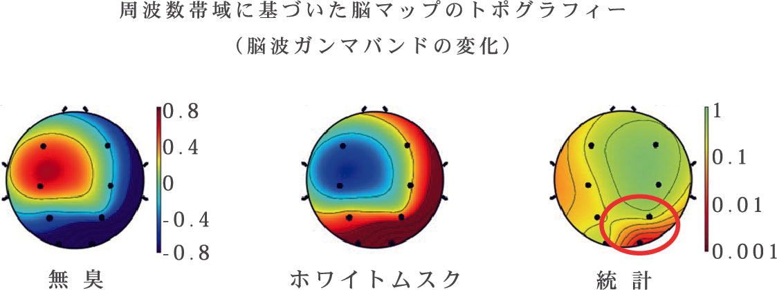 ホワイトムスクが脳波ベータバンドの活動を低下させ、脳にポジティブな感情として好ましい状態を作り、同時に脳波ガンマバンドの活動を増加させ、集中と瞑想状態に入りやすくなることを示しました。