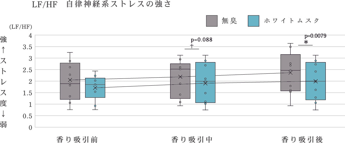 サイエンスアロマのホワイトムスクを嗅ぐことにより、自律神経系のストレスを低下させることができ、さらに、この香りを直接嗅ぐだけでなく、低濃度の残り香を嗅ぐことでもストレスの低下が持続することが明らかになりました。